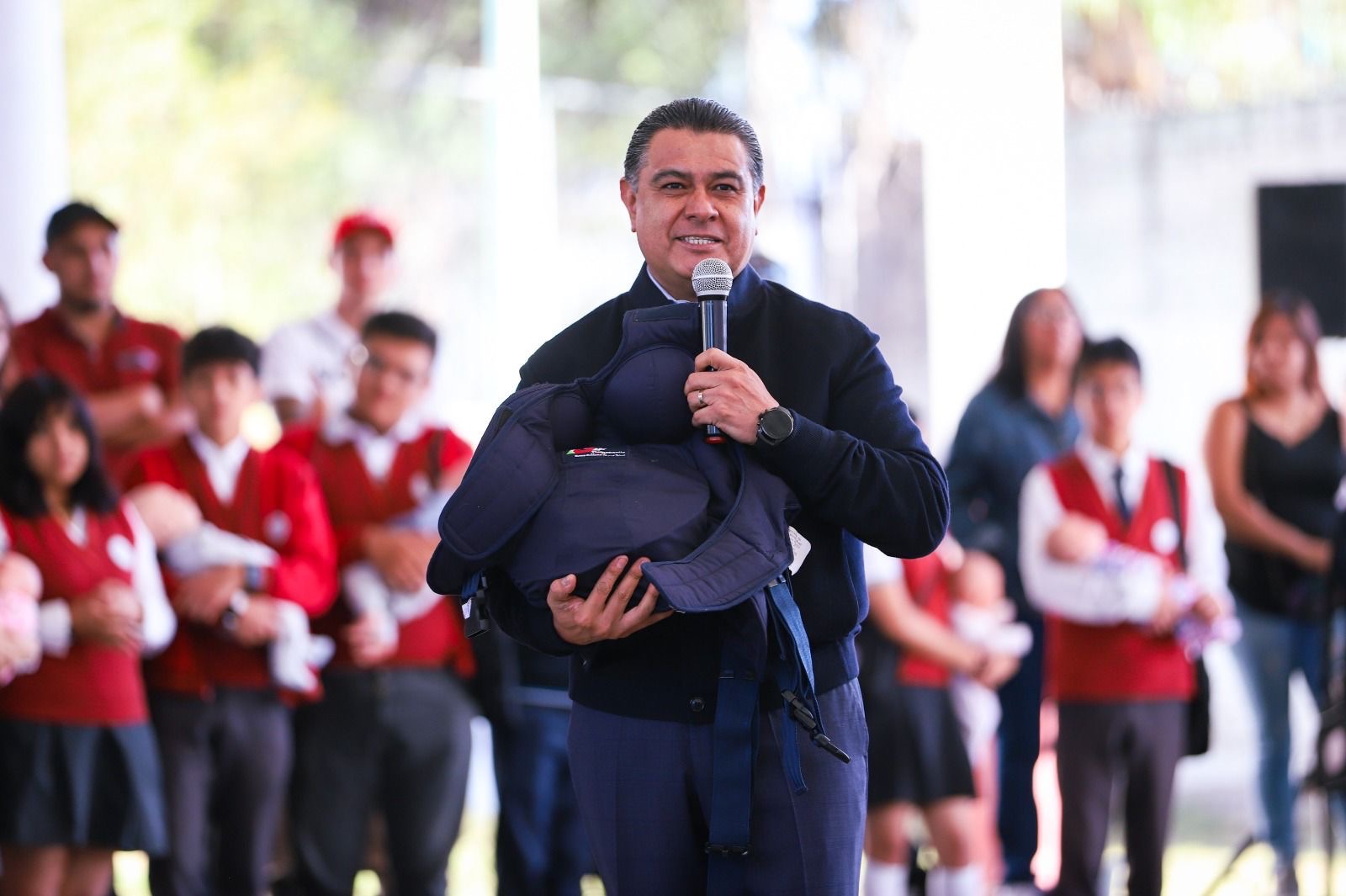 Acompañado de la Presidenta Honoraria del Sistema Municipal DIF, Mary Gómez, el Alcalde visitó la Secundaria General No. 33 “Ricardo Flores Magón”, institución que ya había sido sede de este programa que hoy regresa fortalecido al ya contar con 33 bebés simuladores, dos chalecos simuladores de embarazo y un cuadernillo con la explicación de los costos que implica tener un bebé y los cuidados que este requiere.