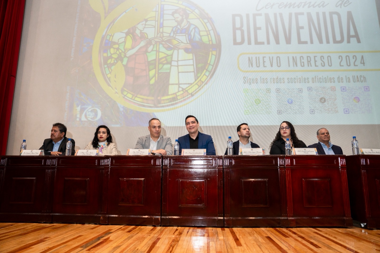 El presídium estuvo integrado por el M.C. Noé López Martínez, Director General Académico; el Dr. Samuel Pérez Nieto, Director General de Patronato Universitario de la UACh; el Ing. Jorge Torres Bribiesca, Director General de Administración; la Mtra. Tania Jessica Pérez Buendía, Directora General de Difusión Cultural y Servicio; la M.C. Lavinia Enid Espinosa Heredia, Directora de Preparatoria Agrícola y el Ing. Jesús Martín Cuanalo Araujo, egresado destacado y Diputado Federal Electo.