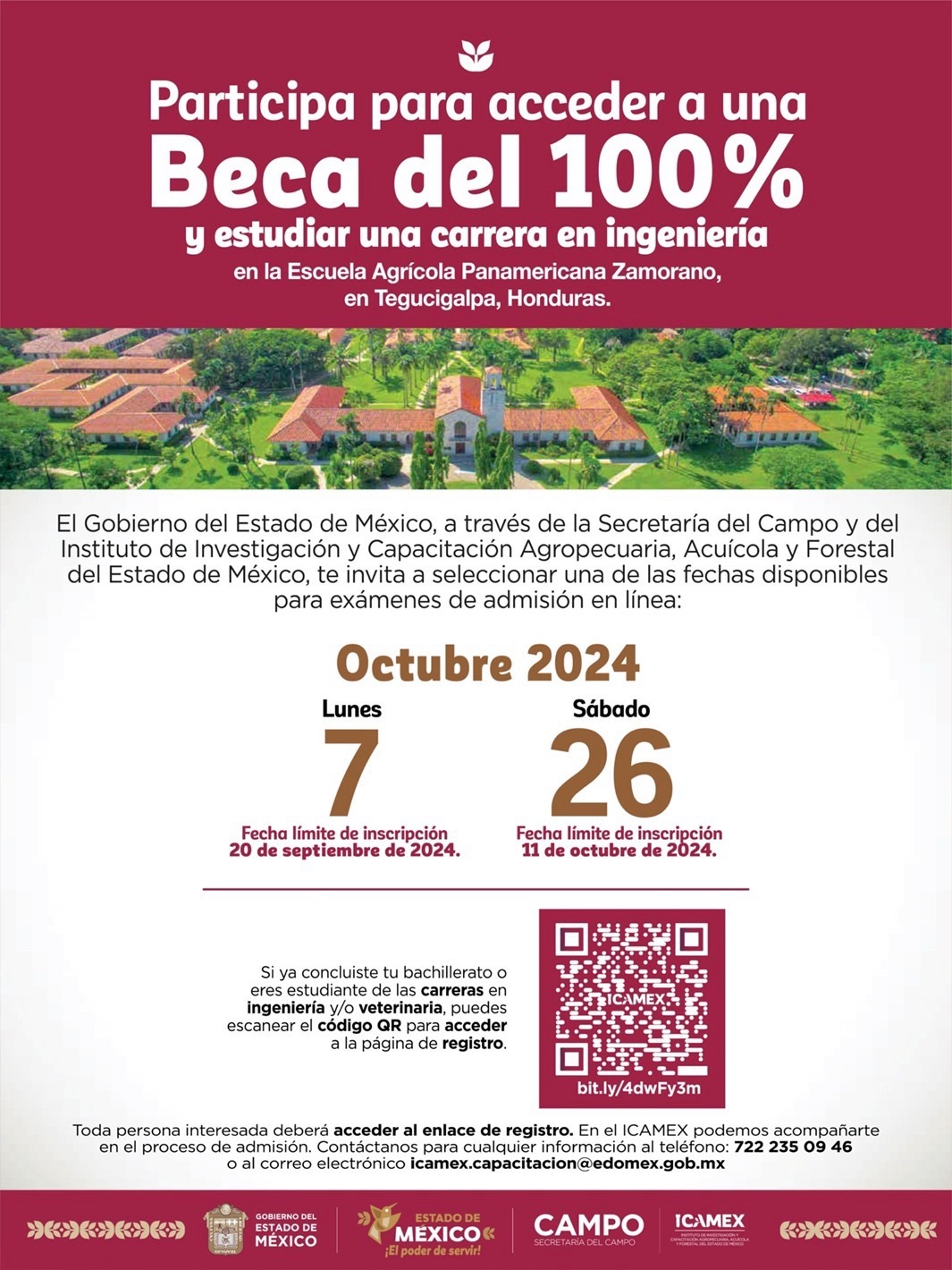 Como cada año el Gobierno del Estado de México a través de la Secretaría del Campo y del Instituto de Investigación y Capacitación Agropecuaria, Acuícola y Forestal del Estado de México (Icamex) ofrece dos becas del 100 por ciento para estudiar en la Escuela Agrícola Panamericana Zamorano, ubicada en Tegucigalpa, Honduras.