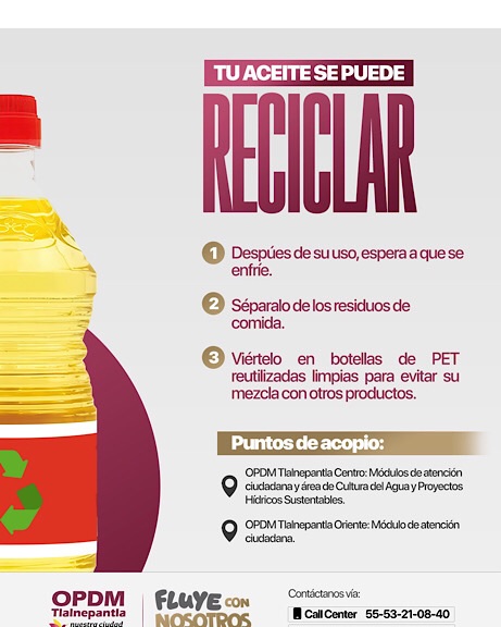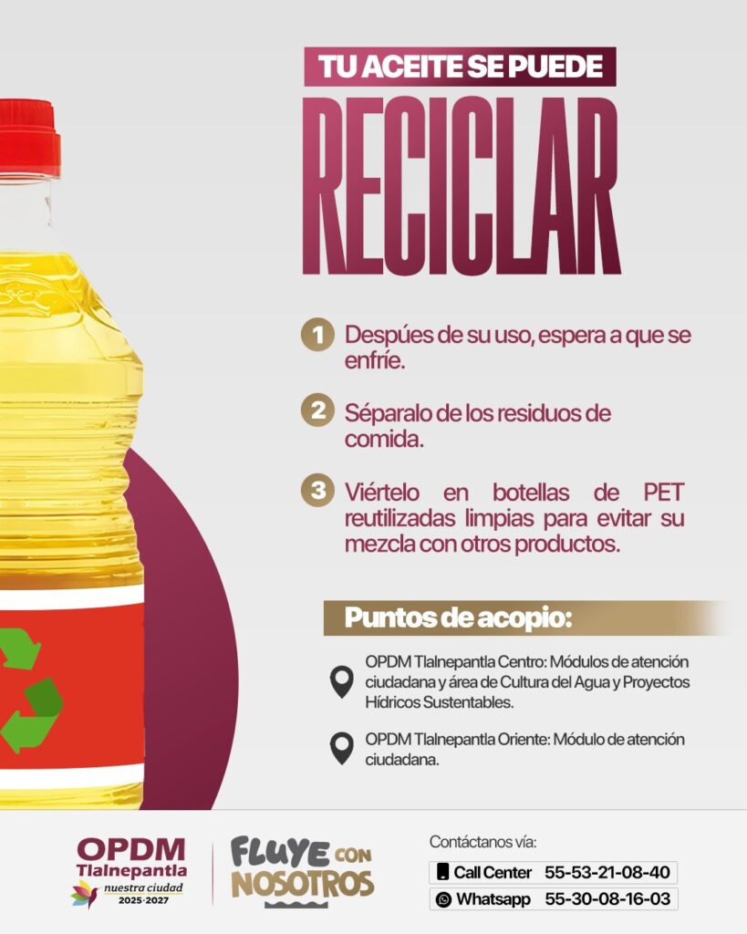 El Gobierno Municipal de Tlalnepantla, a través del Organismo Público Descentralizado para la Prestación de los Servicios de Agua Potable, Alcantarillado y Saneamiento (OPDM), invita a la ciudadanía a participar en la campaña permanente de recolección de aceite vegetal usado, una iniciativa en colaboración con Biofuels de México S.A. de C.V. para promover el cuidado del medio ambiente.