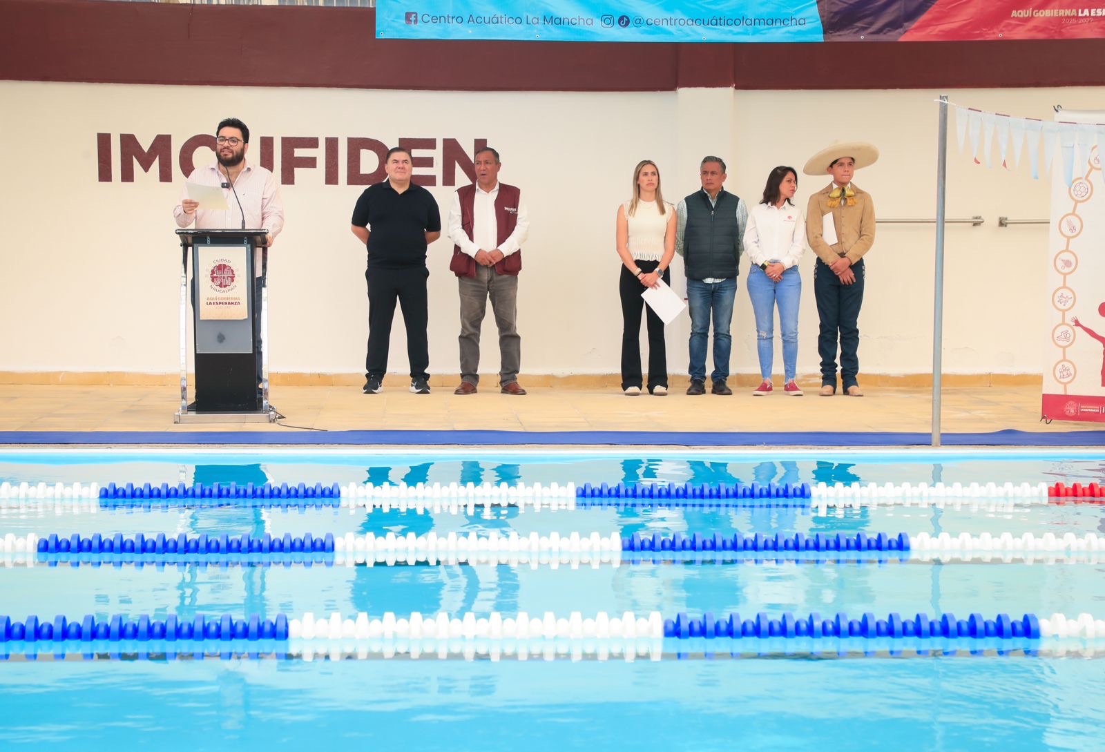 Con la presencia de los medallistas olímpicos Fernando Platas y Jesús Mena, el presidente municipal, Isaac Montoya Márquez, reinauguró la Alberca de la Mancha III, un espacio deportivo que, tras dos años fuera de servicio por malas condiciones, beneficiará a más de 700 personas mensualmente con actividades acuáticas, convirtiéndose en un punto de encuentro familiar y social.