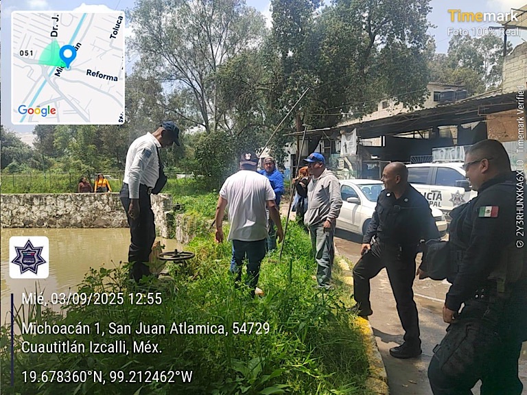 El Gobierno de Cuautitlán Izcalli informa que se atendió una disminución en el nivel del canal Huayapango, en San Juan Atlamica, que causó anegaciones temporales en la cerrada Niños Héroes.