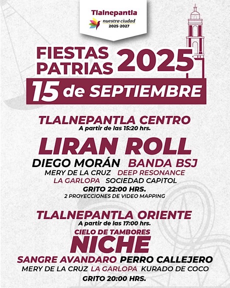 En la explanada del Palacio Municipal, a partir de las 15:20 horas, se presentarán Diego Morán, Banda BSJ, Mery de la Cruz, Deep Resonance, La Garlopa y Sociedad Capitol, con Liran Roll como acto estelar. Además, se proyectarán dos video mappings con temática de la cultura mexicana. En Tlalnepantla Oriente, desde las 17:00 horas, Sangre Avandaro, Perro Callejero, Mery de la Cruz, La Garlopa y Kurado de Coco animarán la velada, mientras que Grupo Niche hará vibrar al público con sus grandes éxitos.