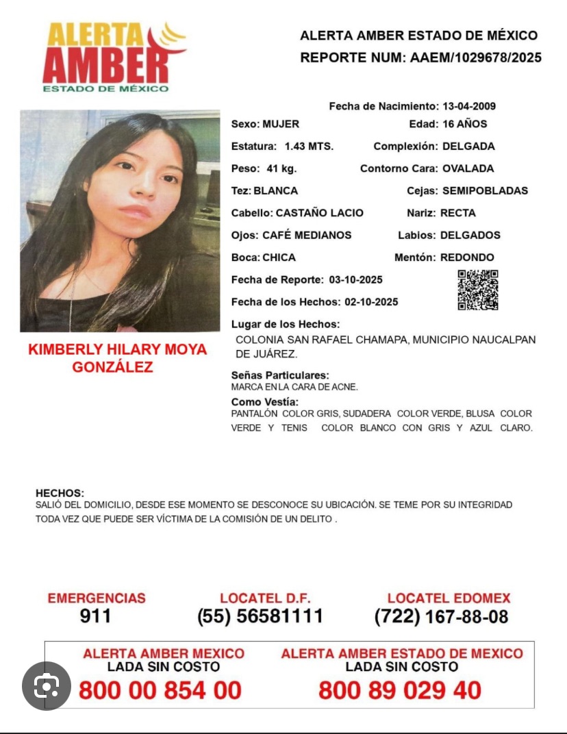 Con relación al caso de Kimberly N., de 16 años, cuya ficha fue difundida mediante la Alerta AMBER Estado de México, el Gobierno Municipal de Naucalpan informa que, desde el primer momento, la Guardia Municipal y la Célula de Búsqueda han acompañado a la familia y participan activamente en las acciones de localización en el territorio.