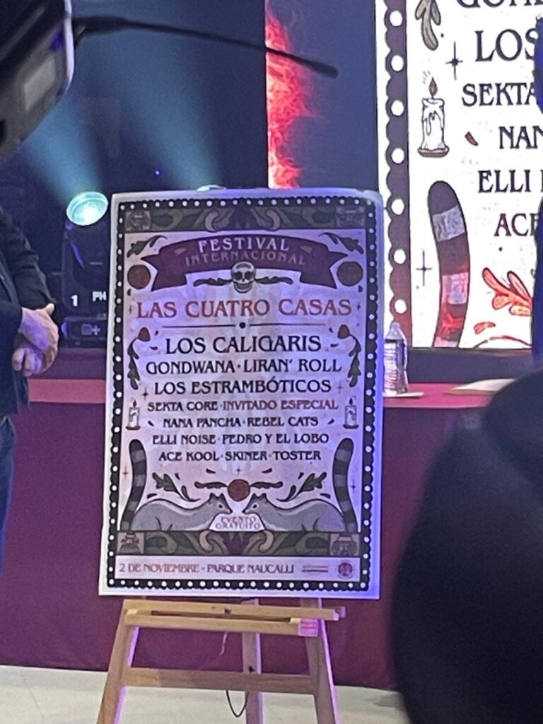 El Gobierno de Naucalpan, liderado por el presidente municipal Isaac Montoya Márquez, presentó el cartel oficial del Festival Internacional “Las Cuatro Casas”, un evento gratuito que se realizará el 2 de noviembre en el Parque Naucalli. Esta celebración reunirá a destacadas bandas nacionales e internacionales como Los Caligaris, Gondwana, Los Estrambóticos, Liran’ Roll, Sekta Core, Nana Pancha, Rebel Cats, Elli Noise, Pedro y el Lobo, Ace Kool, Skiner y Toster, en una jornada musical abierta a todo público.