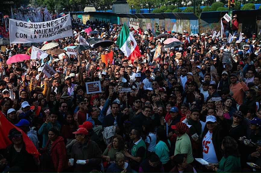 Con batucada, banderas y consignas, el contingente de Naucalpan se integró al río humano que confluyó desde todos los puntos cardinales hacia la Plaza de la Constitución, en una marcha que muchos compararon con la histórica despedida del expresidente Andrés Manuel López Obrador.