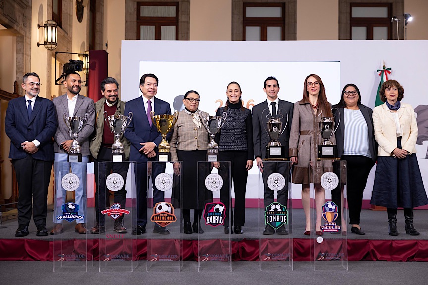 “74 Mundialitos y Copas durante todo el 2026. Y las inscripciones para todas y todos en Conade, en la SEP, en la Secretaría de las Mujeres, en el IMSS, en Instituto de la Juventud y en Secihti”.