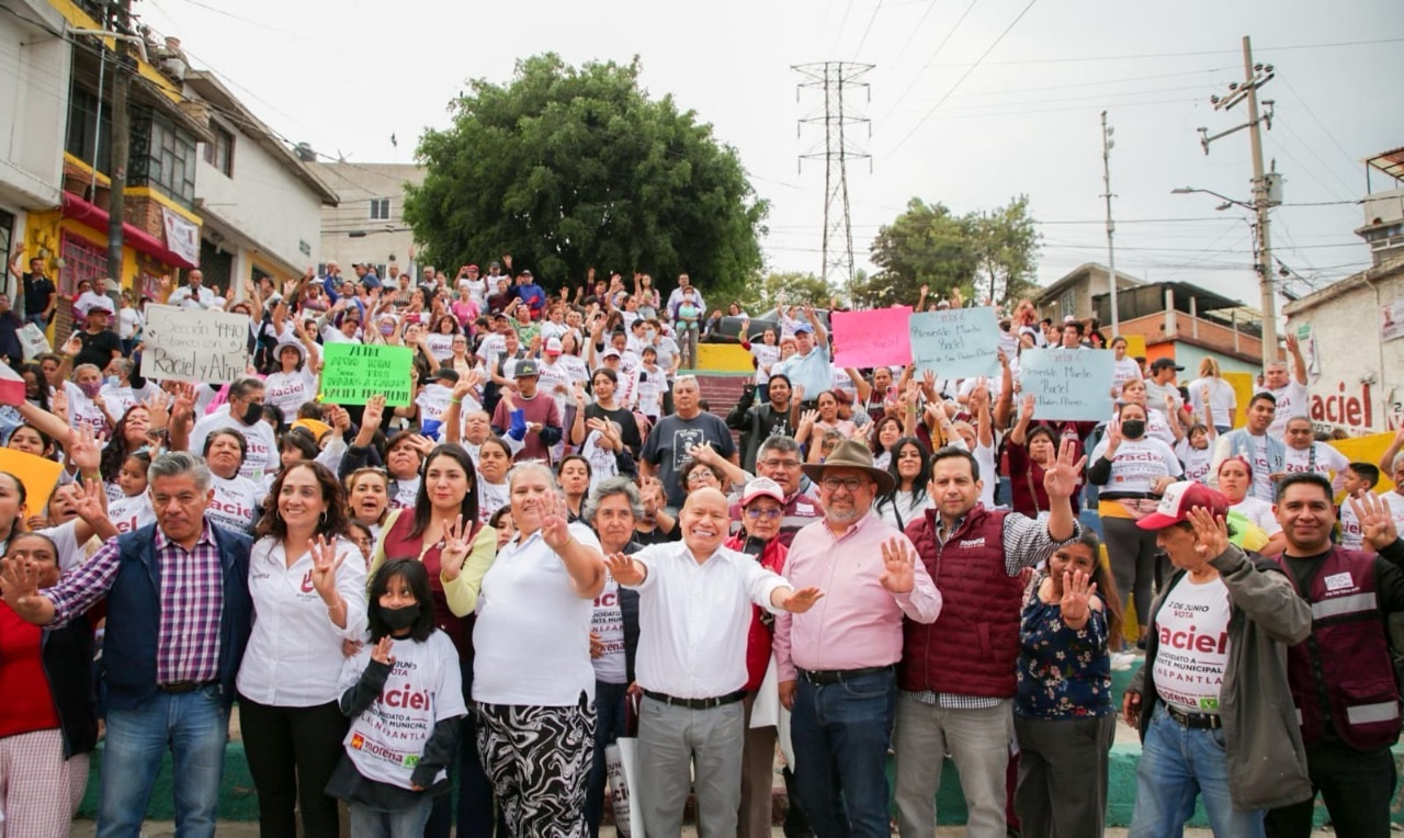 Tlalnepantla de Baz, Estado de México, 08 de mayo de 2024.- El abanderado de los partidos Morena, PT y Verde, Raciel Pérez Cruz, acudió esta tarde a las colonias Lomas de San Andrés Atenco, Benito Juá...