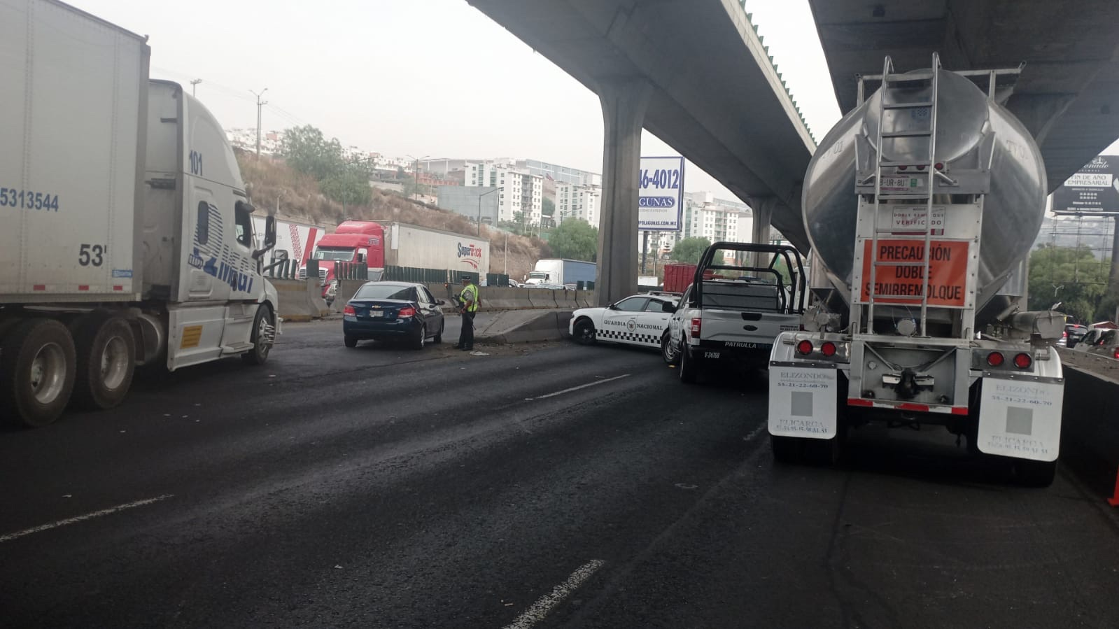Continúan las labores de remoción de los restos del tráiler incendiado la noche de este viernes, en la autopista México – Querétaro, en el tramo La Quebrada y Perinorte, dirección Tepotzotlán, p...